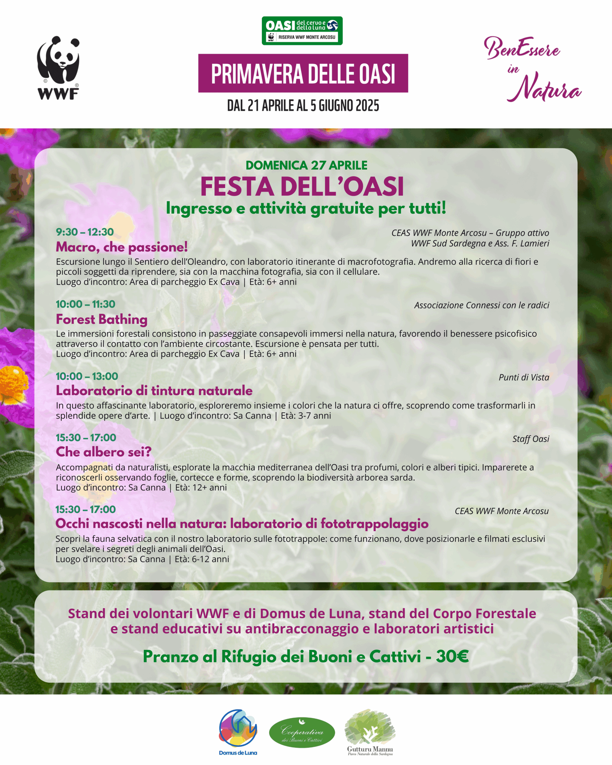 Per informazioni e prenotazioni: info@oasidelcervoedellaluna – 370 1578007 | 370 1255427 (Whatsapp).